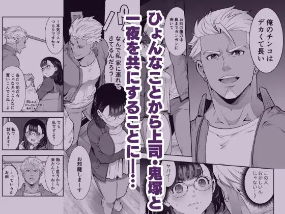 欲求不満の陰キャ事務員が、ガチムチ陽キャ上司のつよつよチ〇ポで三日三晩犯され「足腰立たないセックスをしたい」という希望を叶えて貰う内容となっています。